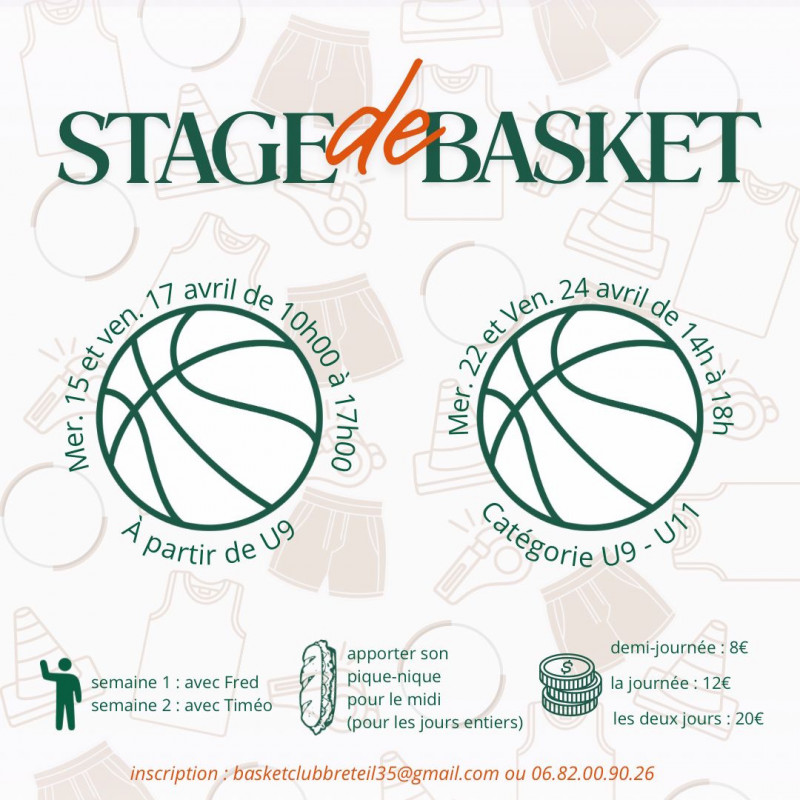 Le Basket Club Breteil vous propose, de la catégorie U9 à U18, des stages de basket, pendant les vacances de Pâques.